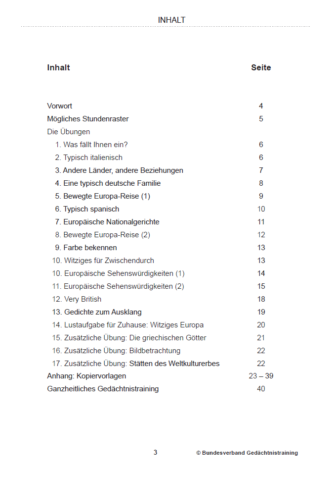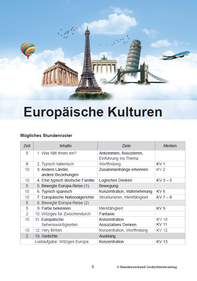 Sie möchten eine abwechslungsreiche Themenstunde im Gedächtnistraining gestalten und dabei Wissen, Biografiearbeit und kognitive Aktivierung verbinden? Mit dem Trainerkonzept „Europäische Kulturen“ erhalten Sie ein sofort einsetzbares Materialpaket für eine 90-minütige Einheit im ganzheitlichen Gedächtnistraining.