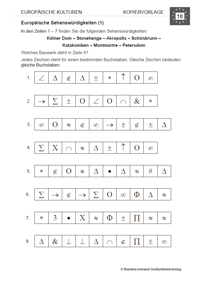 Das Thema Europa bietet vielfältige Anknüpfungspunkte: typische Speisen, berühmte Persönlichkeiten, Sehenswürdigkeiten, Sprache, Musik und Geschichte. Die Teilnehmenden aktivieren ihr Langzeitwissen, trainieren Merkfähigkeit, Konzentration und Wortfindung – und kommen gleichzeitig miteinander ins Gespräch.