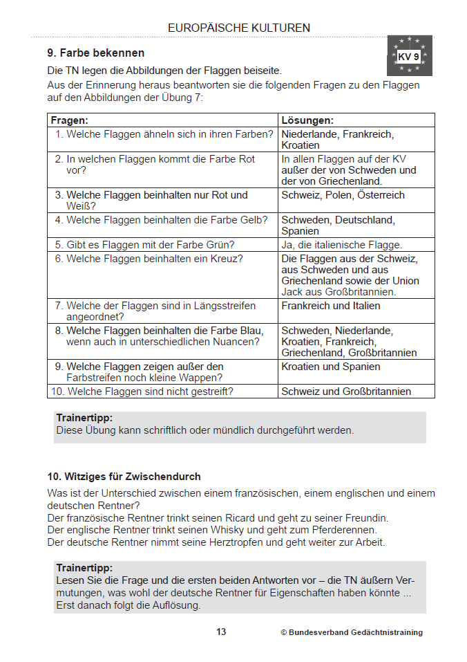 Zahlreiche Trainertipps regen zu biografischem Erzählen an – etwa zu Reisen, landestypischen Gerichten oder bekannten Persönlichkeiten. Das stärkt soziale Interaktion und emotionale Beteiligung.